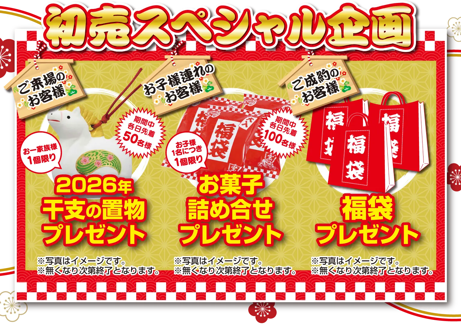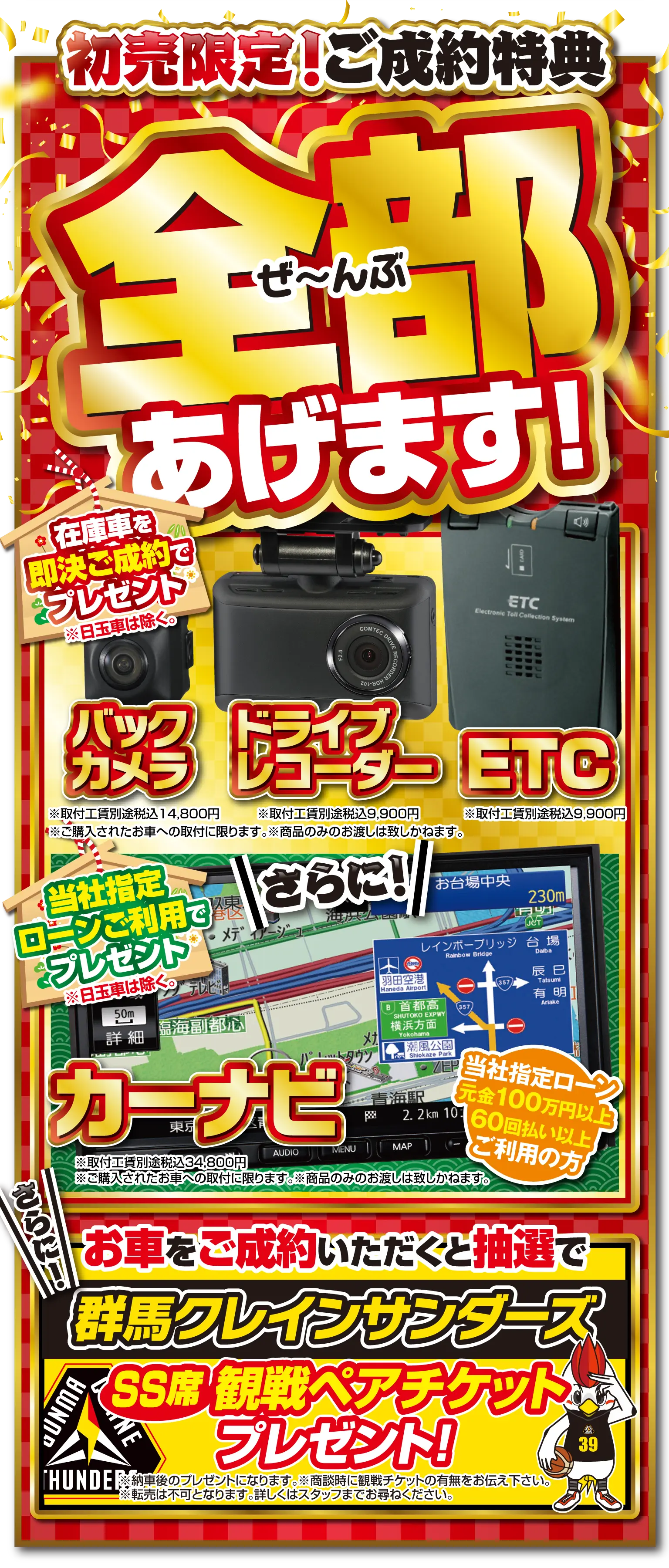※目玉車は除く。※お車を即決でご成約の方に限ります。※プレゼントの品物は当社指定の物となり、お渡しは納車時となります。※付属品は当社指定の物となります。※他の特典との併用はできません。※写真はイメージです。